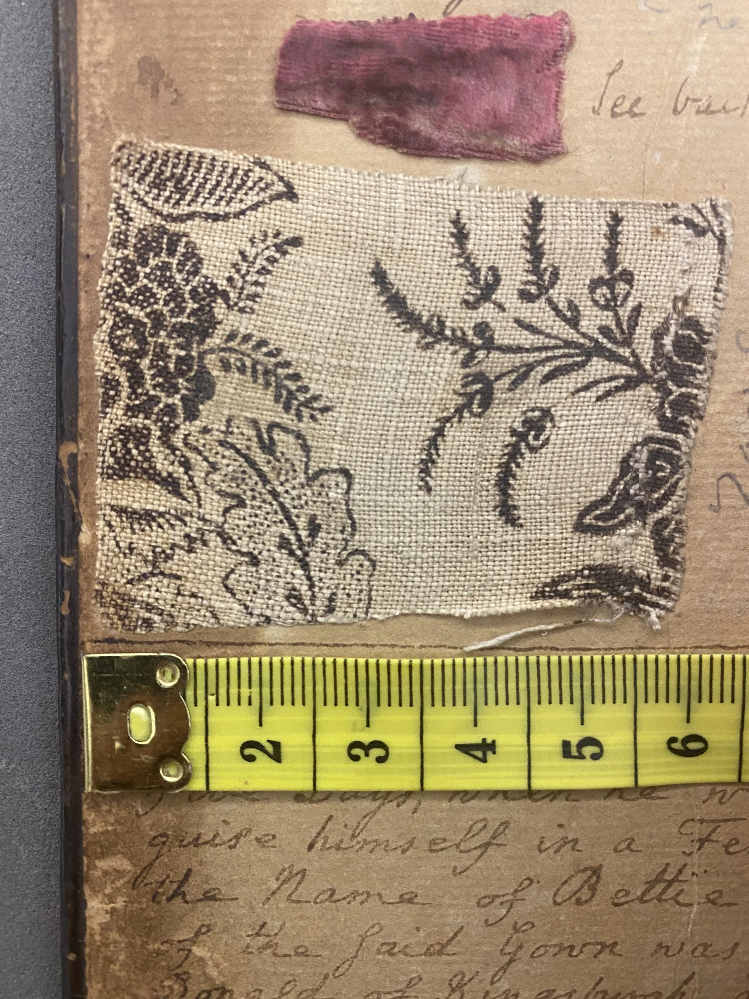 Figure 17: Extant piece of Macdonald of Kingsburgh tartan worn by Prince Charles Edward Stuart in July 1746. Provenance: Macdonald of Kingsburgh to Bishop Robert Forbes. Preserved inside the back cover of volume 3 of Lyon in Mourning. Photo by Jo Watson, 2023 with full permission of the National Library of Scotland.